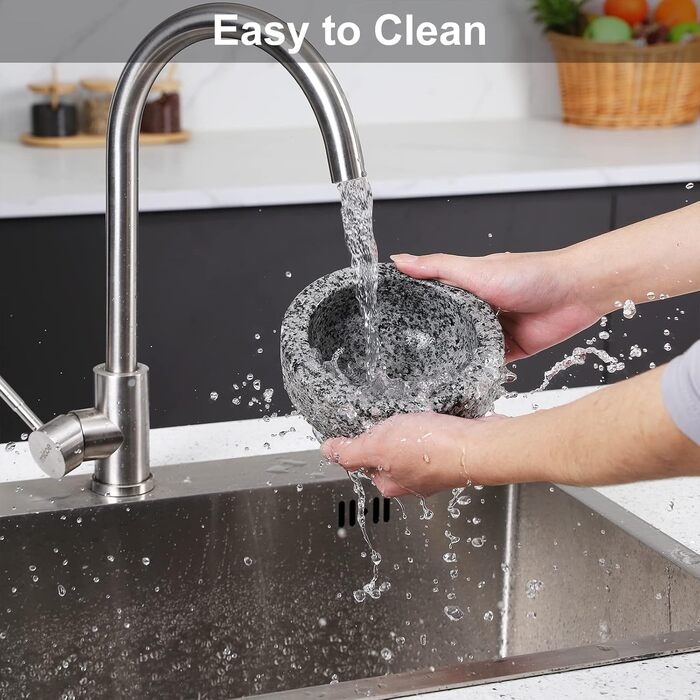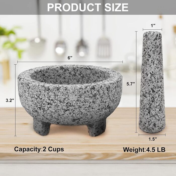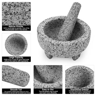 - Незамінні кухонні аксесуари: використовуйте цей елегантний набір з гранітного млинця та пестика для подрібнення спецій, трав, солі та кавових зерен, створюючи страви, такі як гуакамоле, каррі, пасти, дипи, заправки, приправи та багато іншого. Об'єм у 2 чашки дозволить задовольнити більшість потреб на кухні та у повсякденному житті.