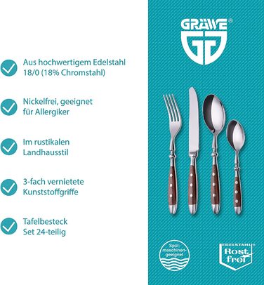 Опис Набір столових приборів GRÄWE Nürnberg для 6 осіб, 24 предмети, нержавіюча сталь, ковані, важкі, з коричневими ручками, стиль рустик