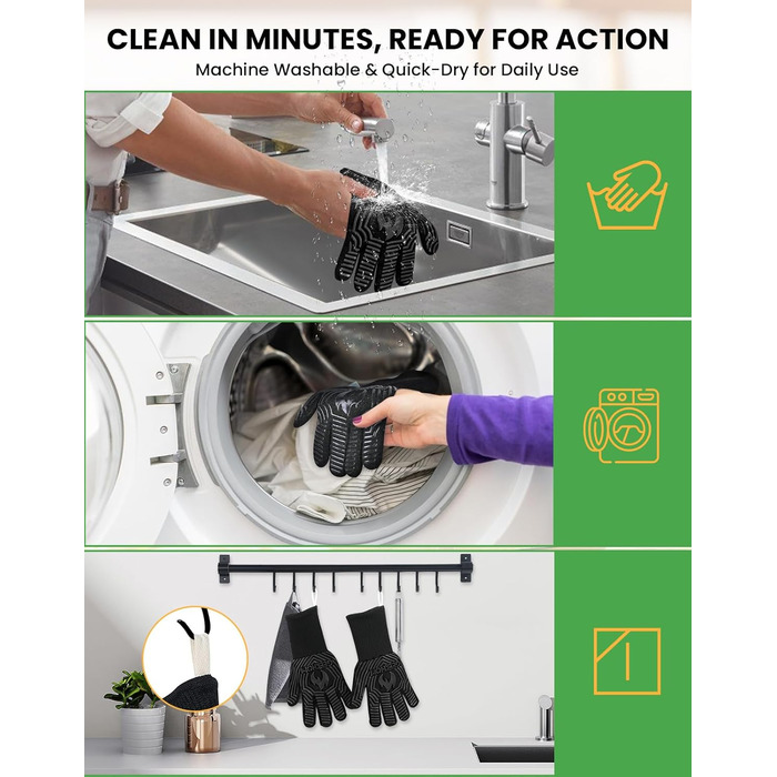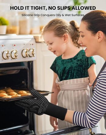 - НАЙКРАЩИЙ СПОСІБ ЗАХИСТИТИ РУКИ ВІД ОПІКІВ: Рукавички для барбекю надзвичайно термостійкі виготовлені з кевларової тканини, різновиду професійного матеріалу для гриля, термостійкого, стійкого до порізів і надміцної синтетики, відомої своєю здатністю витримувати високу температуру нагрівання до 800C/1472F. Крім того, силіконові супер ручки на рукавичці гарантують, що нічого не вислизне з рук.