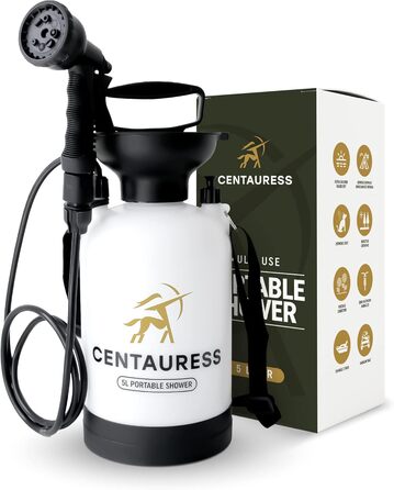 - Портативний душ для кемпінгу: виготовлений з поліетилену високої щільності, цей портативний душ об'ємом 5 л може витримати будь-які умови. Наш насос для душу для кемпінгу має шланг довжиною 1.7 м, 8 налаштувань форсунок і тримач для душу для підтримки насадки в чистоті.