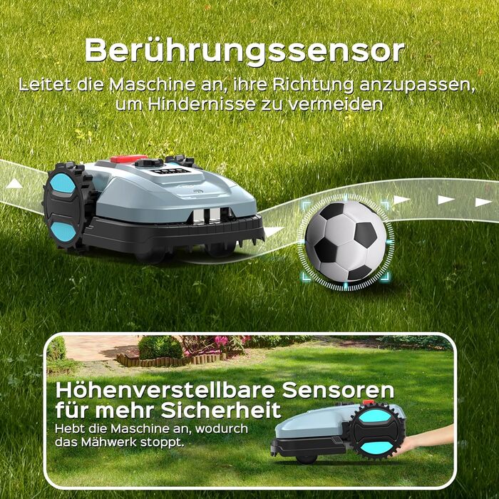 - Подвійні функції безпеки для безтурботного використання: оснащена точними датчиками зіткнення, роботизована газонокосарка виявляє перешкоди та негайно змінює напрямок, щоб уникнути подальших зіткнень. Червона кнопка зупинки на верхній частині пристрою забезпечує додаткову безпеку. Рослини, садові меблі або обладнання дитячого майданчика залишаються неушкодженими. Особливо в домогосподарствах з дітьми або домашніми тваринами, роботизована газонокосарка забезпечує надійний і заспокійливий досвід використання