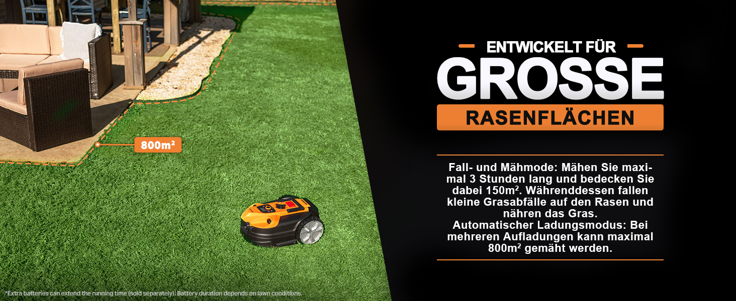 Ця модель ідеально підходить для газонів площею до 800 м² та оснащена потужним акумулятором на 4 А·год, що забезпечує до 4 годин безперервної роботи. Завдяки відсутності обмежувального дроту, ви можете насолоджуватися безперешкодним косінням по всій площі газону.