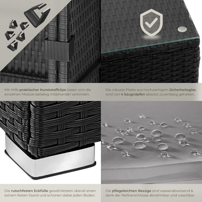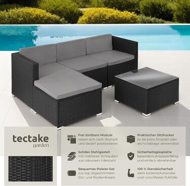 Опис Комплект садових меблів з поліротангу tectake®: диван, крісла, пуф, стіл, модульний, для 3-4 осіб, чорний, для тераси, балкона, саду, стійкий до погодних умов