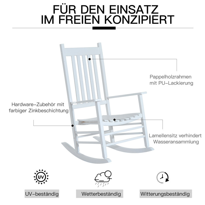 Опис Дерев'яне крісло-гойдалка Outsunny з підлокітником, крісло-гойдалка Relax Chair Садове крісло білого кольору, 69 x 86 x 115 см, ідеально підходить для саду та тераси